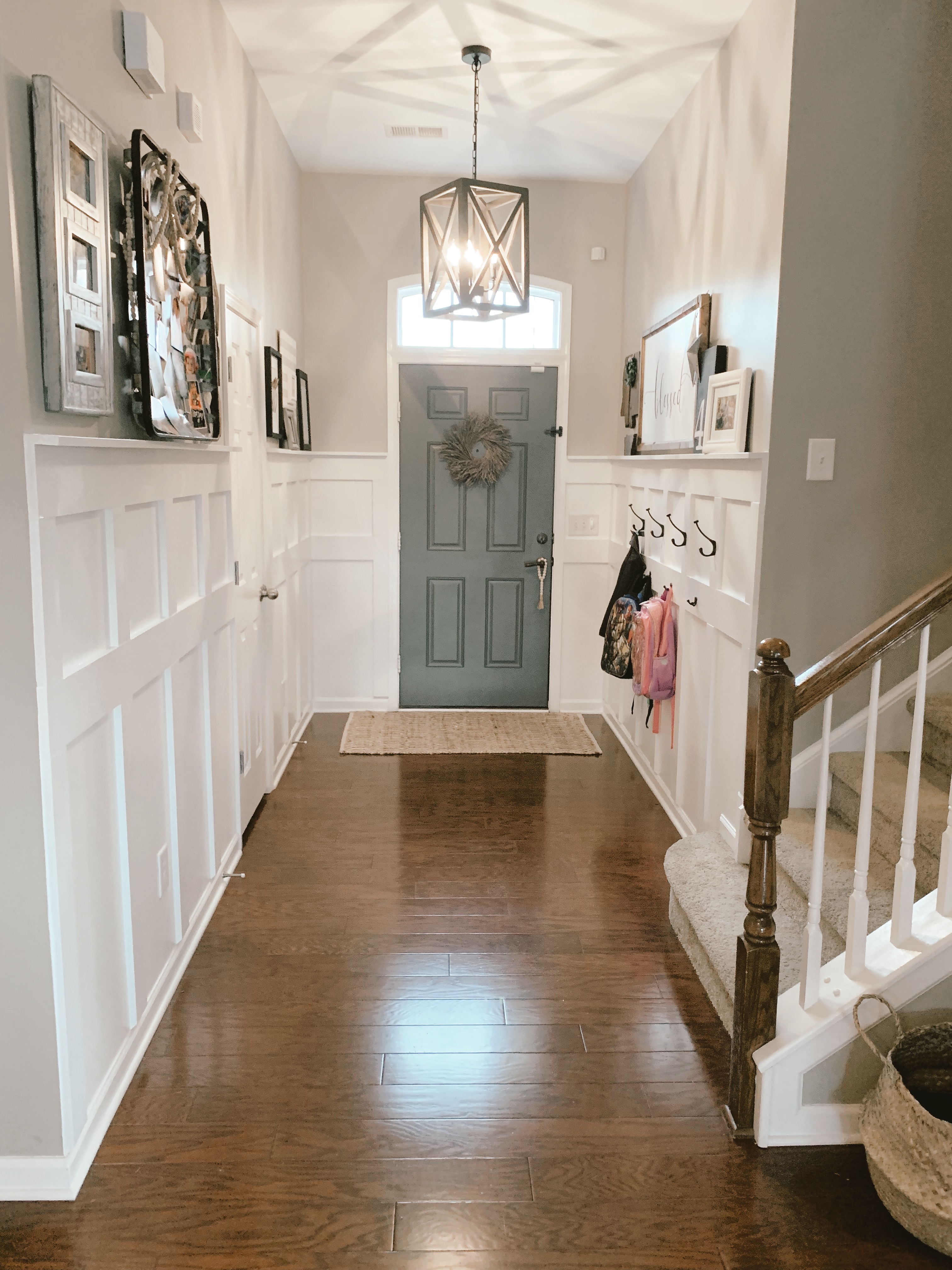 Our entryway… π This time last year I couldn’t stand it anymore! The first impression of our home was dark, boring, and had hooks that were too high for the kids (hence backpacks on the banister and floor). I researched diy blogs on how to install board and batten for months and then decided to jump in! It took a long time, and I was out of my comfort zone. But now, we LOVE it! π It’s not perfect (we are NOT carpenters by any means), but not only is it a statement when you walk in the door, it is a much more efficient use of space! The kids know exactly where to put backpacks, and we all love seeing all the family photos! It is beautiful AND useful to us which is more than we could ask for! β€οΈπ