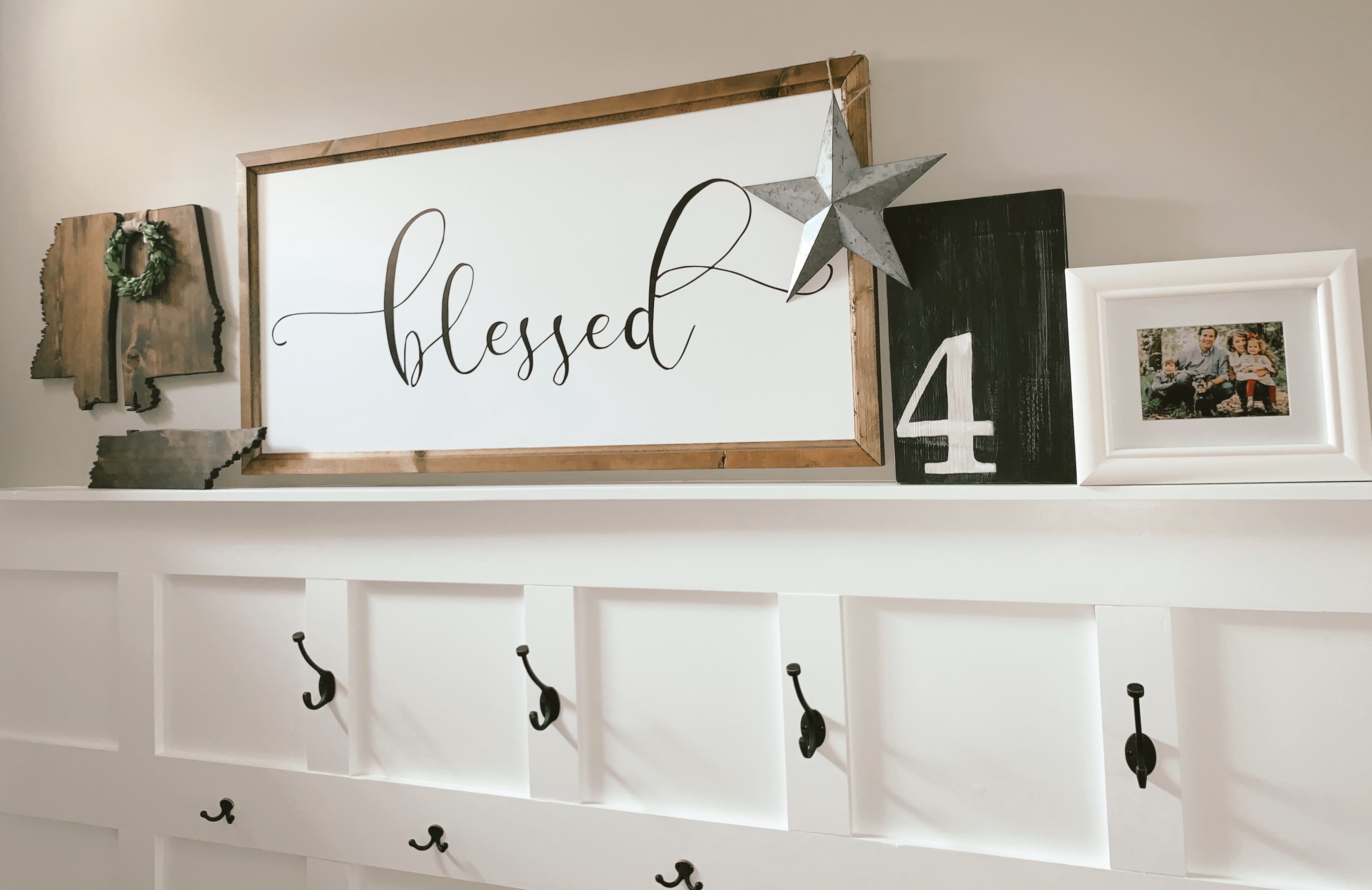 Honestly, it took me almost as long to style it as it did to build it. I wanted it to be personal to our family, so I included cutouts of the 3 states we’ve lived in, family photos (recent and old ones) and family heirlooms. It’s so us, and we love it! Thanks so much for checking it out! Please comment if you have any questions!